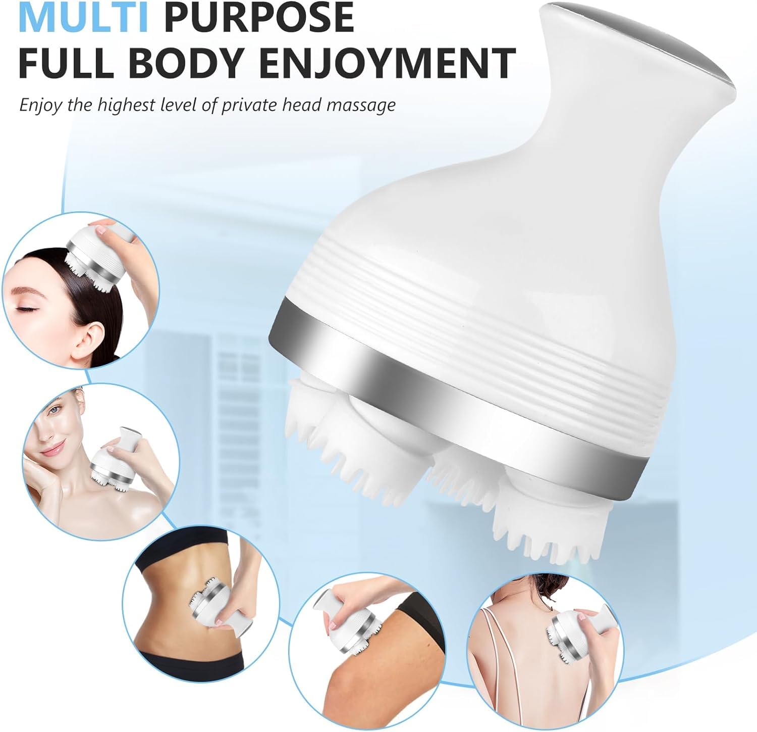 - Electric Scalp, Head Kneading Massager : the All-In-One Revive Electric Scalp & Head Massager Comes with Four 360-Degree Rotating Heads and 96 Soft Silicone Bristles Offering You the Most Relaxing, Tangle-Free, and Soothing Massage! You Can Also Use This Head Massager with Your Favorite Hair Oil, as the Silicon Heads Are Detachable and Can Be Cleaned & Washed. The Gentle Rotating Action Encourages Endorphin Release and Improves Blood Circulation, Which Can Reduce Headaches and Lead to Better Hair Growth.
